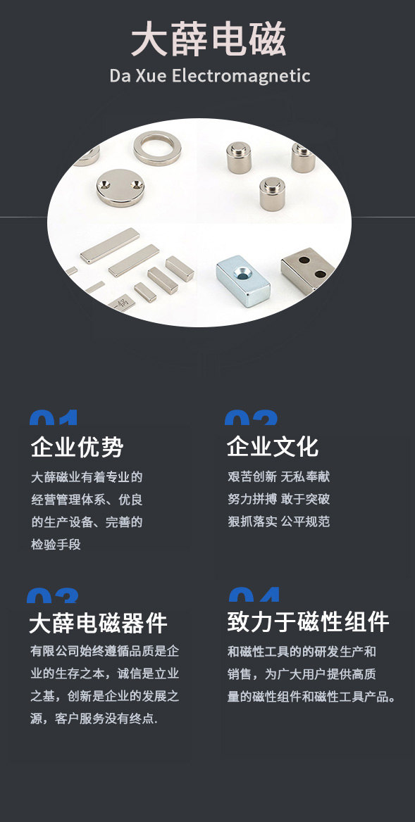 上海大薛电磁器件有限公司是专门从事钕铁硼稀土永磁材料以及磁性组件、磁性工具方面生产和销售的创新型企业。大薛磁业有着专业的经营管理体系、优良的生产设备、完善的检验手段、以及好的售后服务,公司生产和销售各种性能、各种形状的钕铁硼稀土永磁类产品;另外公司凭借磁性材料和机械加工方面的丰富经验和强大的生产能力...
