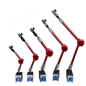 磁性表座也称万向表座。是机器制造业用途多,广泛适用于各类机床,也是必不可少的检测工具之一,同时还应用于各种科研机构及高等院校的科学研究中测量精度。它里面是一个圆柱体,在其中间放置一条条形的永磁铁,外面底座位置是一块软磁材料,使用时,通过转动开关,来转动里面的磁铁。当磁铁的两极呈上下方向时,软磁材料的底座就被磁化,这个方向上具有强磁性,所以能够吸住钢铁表面。而当磁铁的两极处于水平方向时,两极的中间正对软磁材料底座时,底座不会被磁化,所以底座上磁力很小,就可以很轻易地工作面上取下来。
